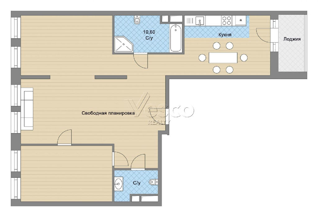 Планировка: кухня гостиная, 2 спальни, 2 санузла, балкон.